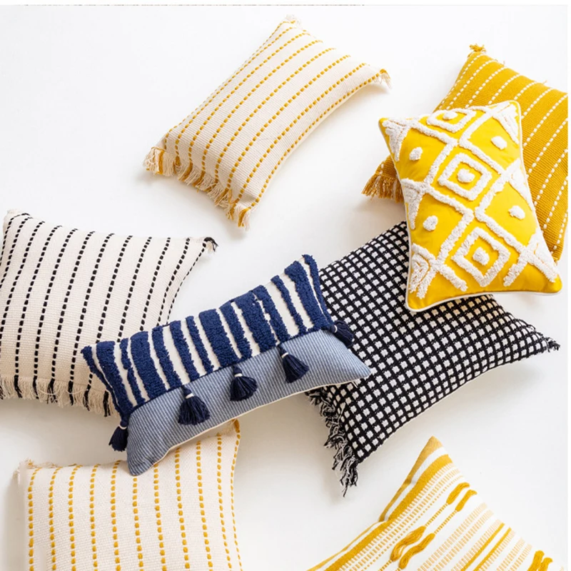 Descubre la versatilidad de la Funda de cojín geométrica tejida con borlas rayadas de ganchillo