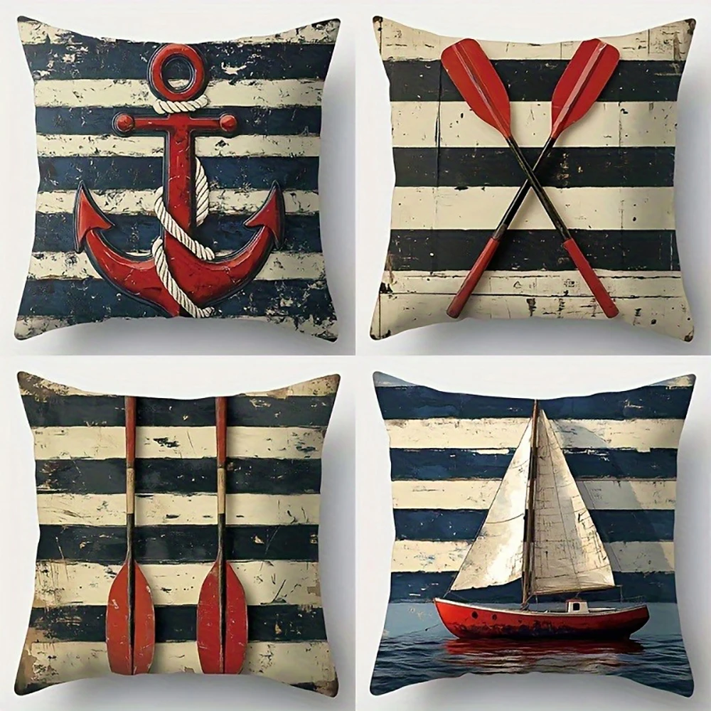 Diversidad de usos para la funda de cojín con ancla roja en fondo a rayas