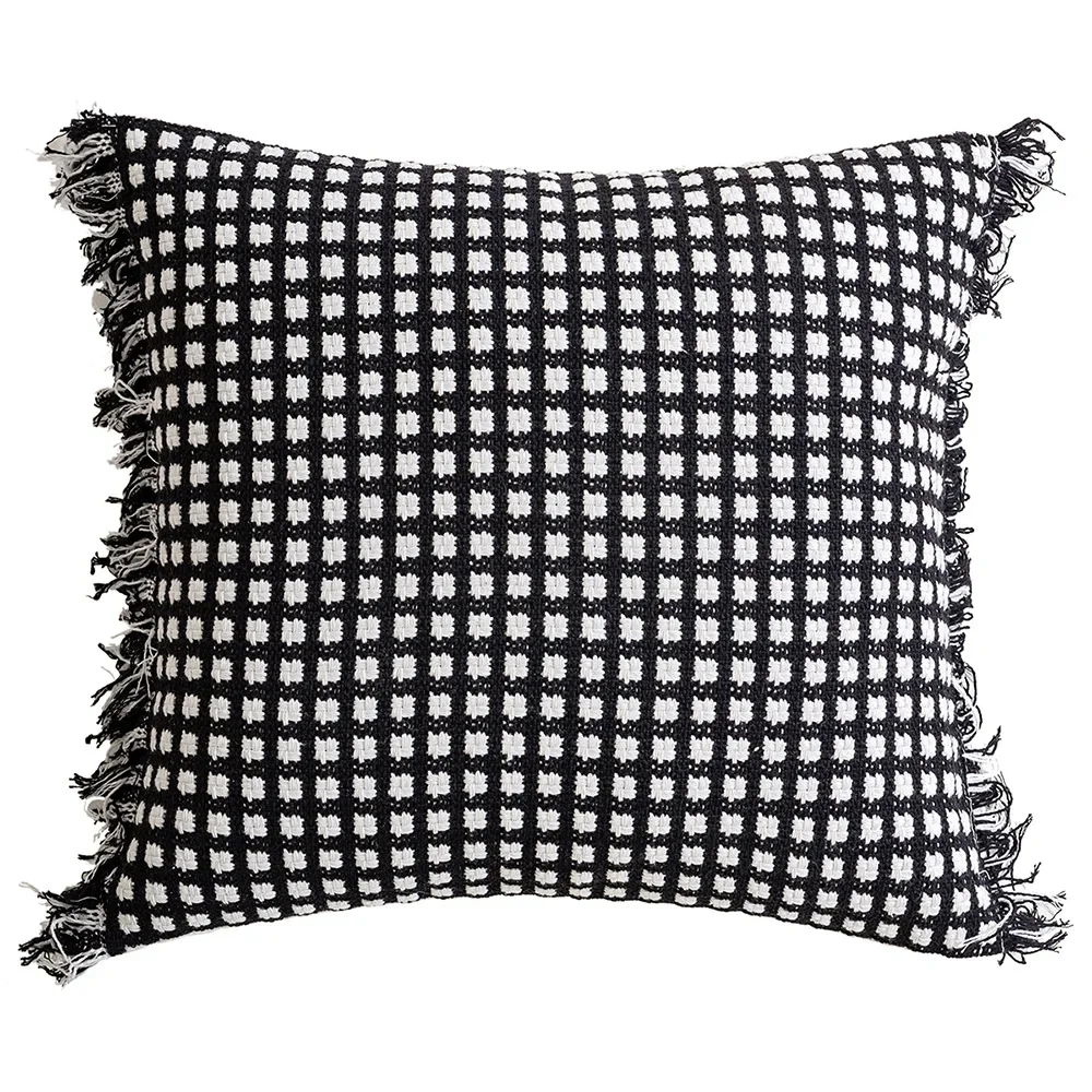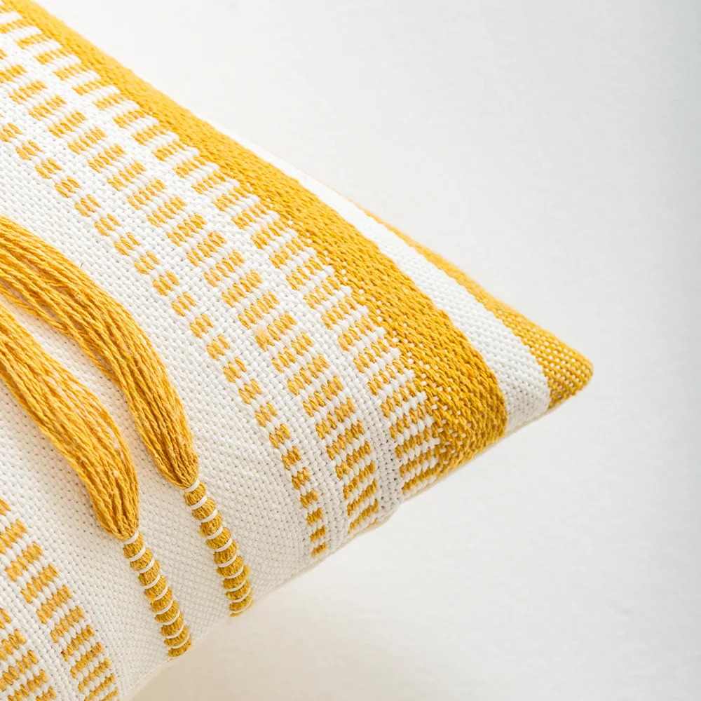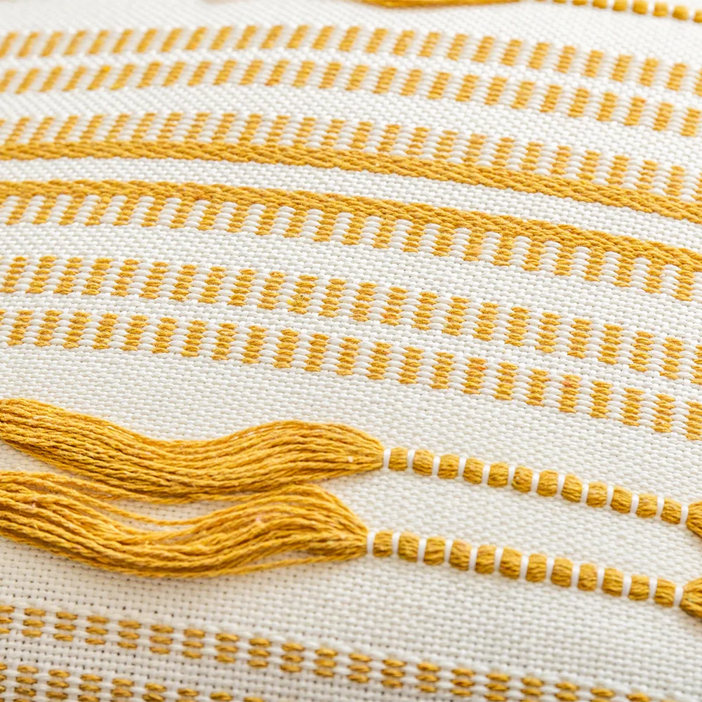 La Funda de Cojín Nórdica Amarilla con Rayas es perfecta si buscas agregar un toque de color y modernidad a tu espacio. Con un diseño geométrico crochet combinado con borlas elegantes, aporta una sofisticación instantánea a cualquier habitación de tu hogar.